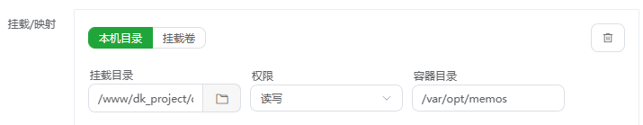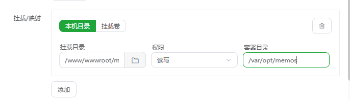 添加挂载,本机目录找一个自己可以找到的地方,容器内部路径为/var/opt/memos(此路径为容器内部数据存储路径)