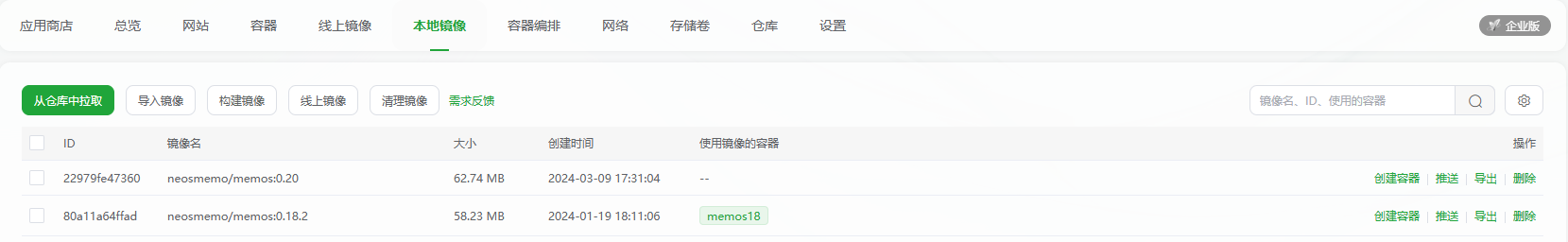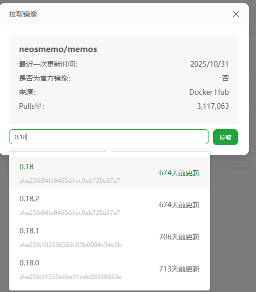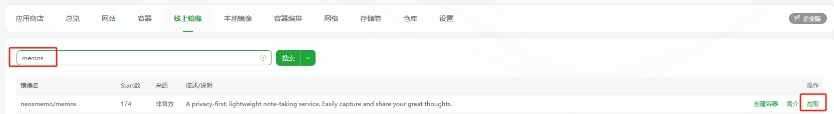 搜索memos 选择官方的镜像,点击右边的拉取(这里也可以直接创建容器,但是要注意改一下镜像,默认为lastas)
