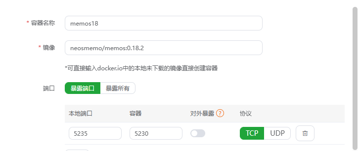容器名称起一个自己方便的即可;添加暴露端口,本地端口即为本地可以访问的端口,容器端口即为内部端口,开启内部访问之后便可以通过ip+端口访问,(本地部署开启外部访问;云部署有域名不开启外部访问直接反代即可)